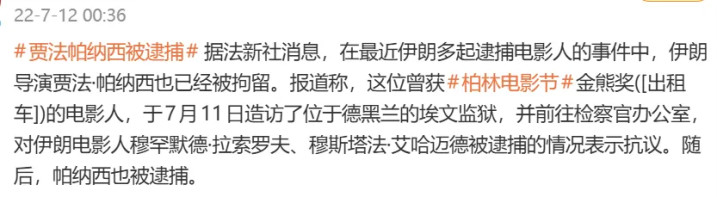 贾法因抗议伊朗政府强权抓捕多名电影人再次被捕入狱,判刑六年。