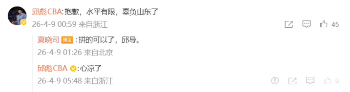 今日凌晨,邱彪社媒回应媒体人:抱歉水平有限辜负山东了,心凉了。