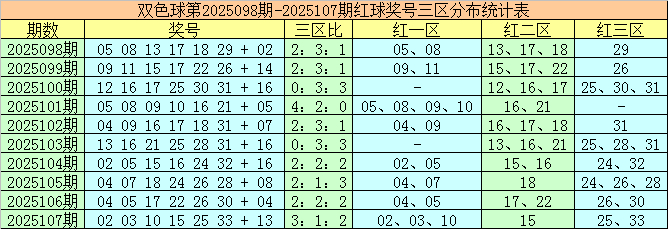双色球第2025107期开出奖号为:02、03、10、15、25、33+13,其中红球三区比为3:1:2,蓝球开出奇数、大号、1路号码。