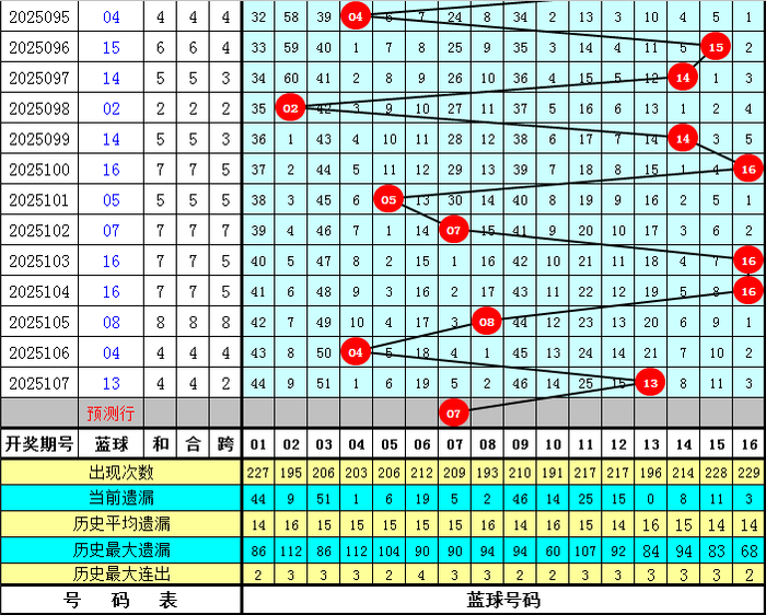 上期开出蓝球号码13,该号码在最近300期中出现了17次,其下期分别开出:蓝球03出现4次,蓝球15出现3次,蓝球06出现2次,蓝球01、02、04、05、07、11、14、16出现1次,蓝球08、09、10、12、13出现0次。本期五码蓝球参考04、05、07、09、14,独蓝关注07。