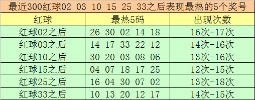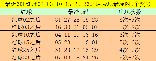 红球冷码统计:双色球第2025107期开出红球奖号分别为:02、03、10、15、25、33,在最近300期开奖中,各号码出现之后其下期出现最少的5个红球分别为: