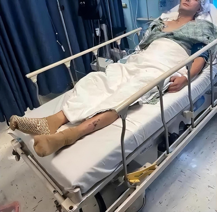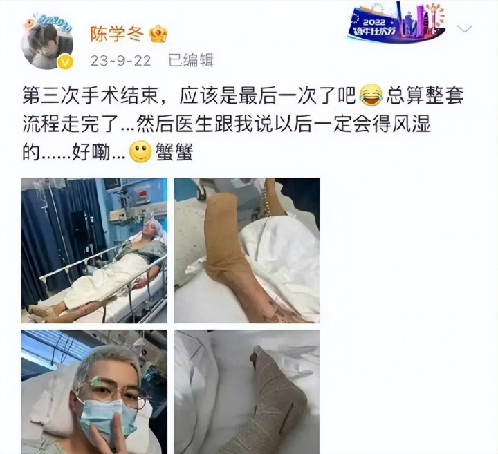 他在网上晒出脚上缠满纱布的照片,调侃那长长的疤痕是“买一送一”,到了2025年5月,他又一次躺在了病床上,配文说“希望是最后一次”。