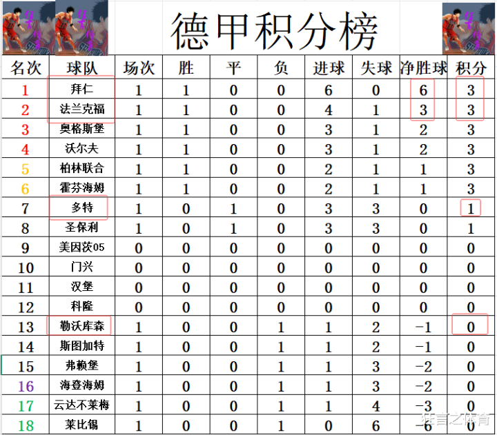 积分榜方面,到目前为止,首轮就只有圣保利绝平多特这场是平局,其他都分出了胜负,拜仁6个净胜球稳居榜首,法兰克福大胜开门红,3个净胜球排在拜仁之后位列第2。多特排在第7,输球的勒沃库森排在第13,一上来两队就落后于拜仁,或许之后要追上拜仁就有难度了。