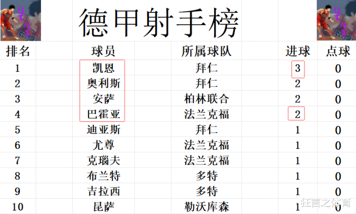 射手榜方面,凯恩3球领跑,法兰克福的前锋一直被挖走,不过他们总又能培养出新的得分手,巴霍亚今天梅开二度,,他和安萨追上奥利斯,三人2球并列第2。克瑙夫,布兰特,吉拉西,尤尊等人1球上榜。