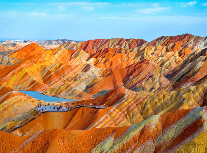 6、甘肃张掖丹霞地貌。位于甘肃张掖市甘州区临泽县。是我国干旱地区最典型和面积最大的丹霞地貌景观。整个张掖丹霞区目前开发主要有两个,一个是临泽丹霞和冰沟丹霞,林泽丹霞开发相对成熟,主要有1234号观景台和冰沟等景区组成。