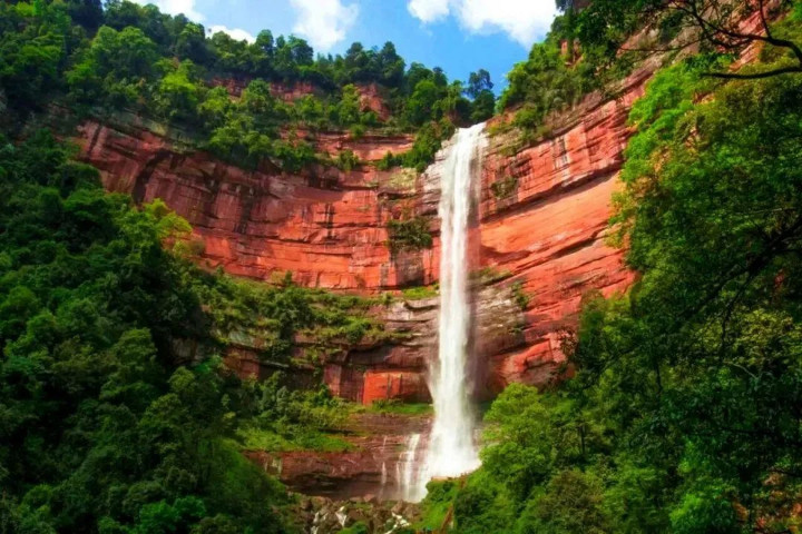 7、贵州赤水丹霞地貌。位于贵州遵义市赤水市元厚镇。这里有赤水丹霞旅游区的大瀑布,是中国丹霞第1瀑,震撼人心,76米高80米宽。还有佛光岩,世界丹霞之冠,红岩绝壁,壮观无比。还有莲花台、燕子岩、四洞沟各具特色,亲子游玩好去处。