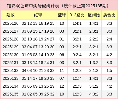 红球三区比4:0:2,质合比为3:3,012路比为1:2:3,蓝球为合数、1路号码。
